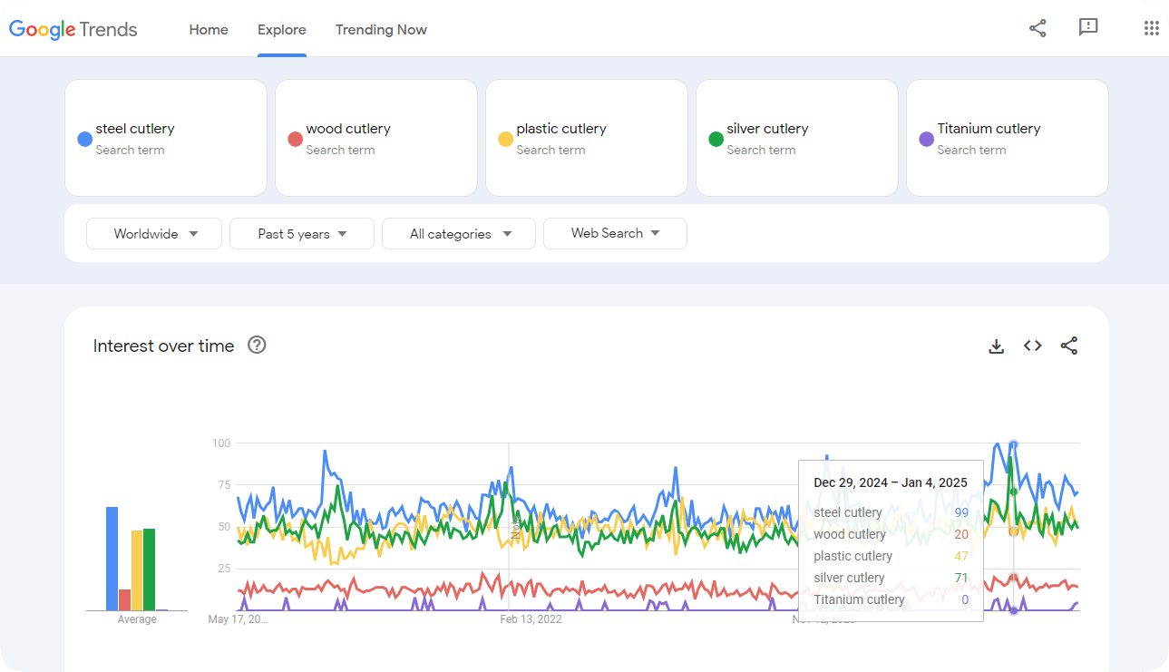 | Titanium | $18.00 – $50.00 | High-end cutlery, camping gear | Yes | Yes | ~430 | 20+ | Lightweight, corrosion-resistant | Expensive |